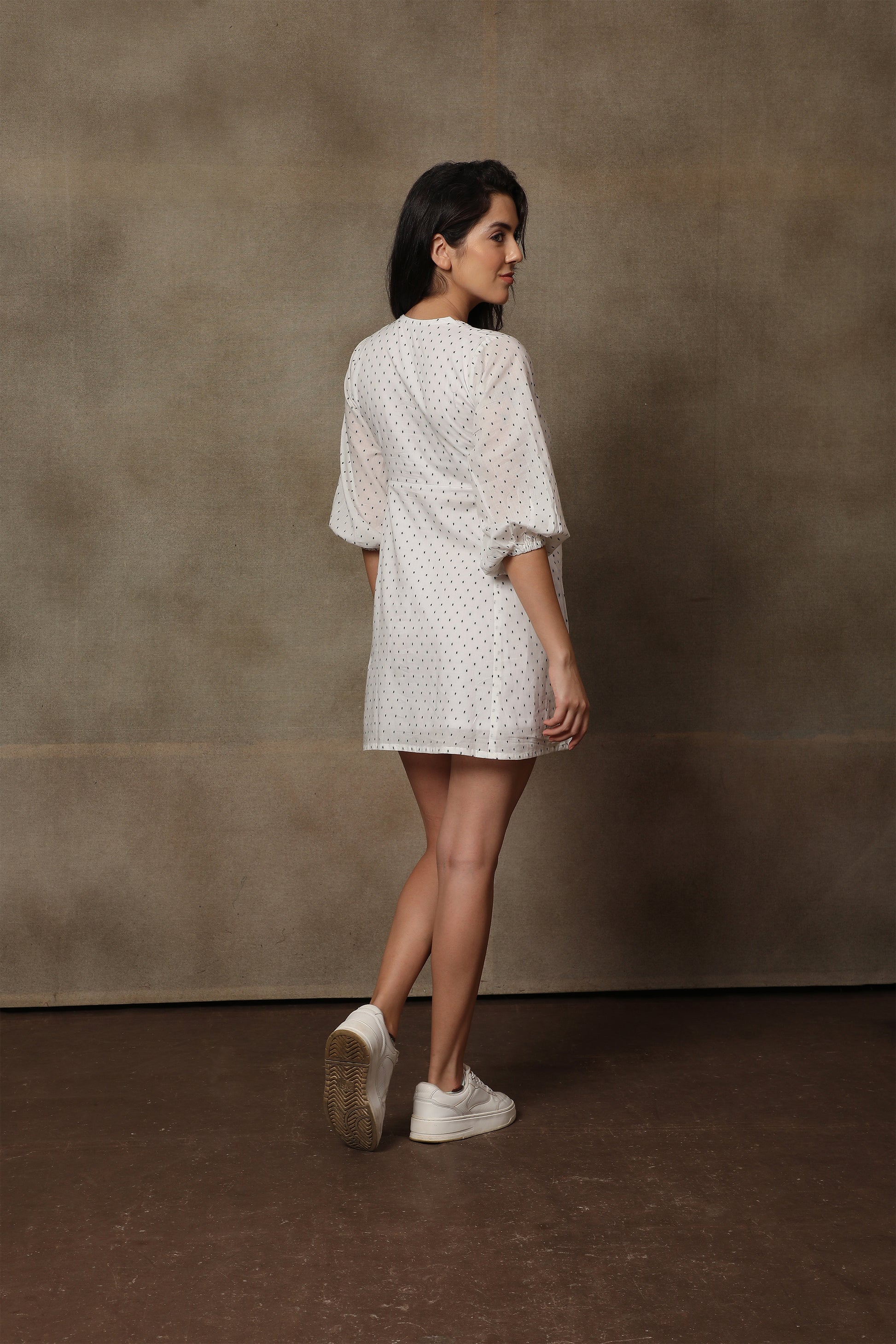 Redefine classic charm with our Marshmallow Short Dress in white organic cotton, showcasing intricate black woven patterns, a V neckline, and playful balloon sleeves with elastic detailing.
