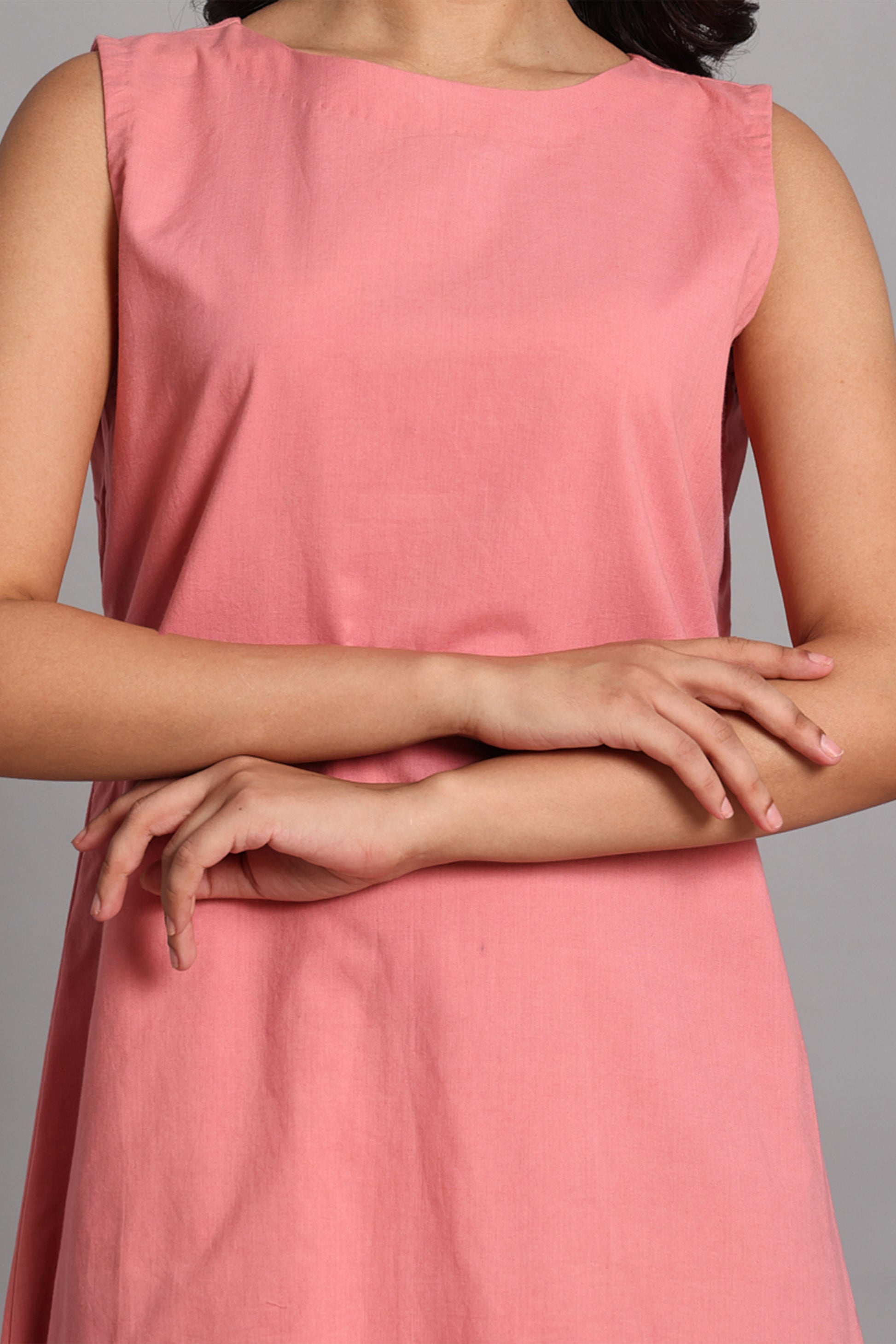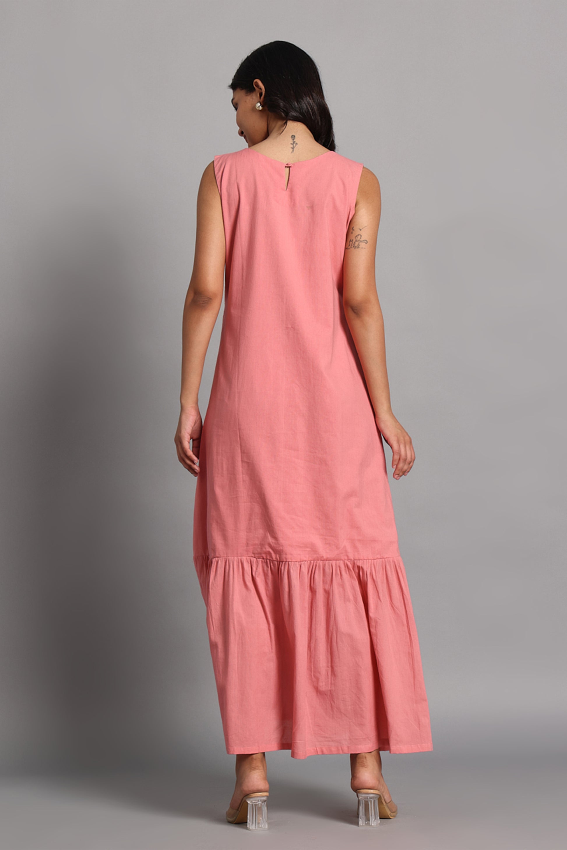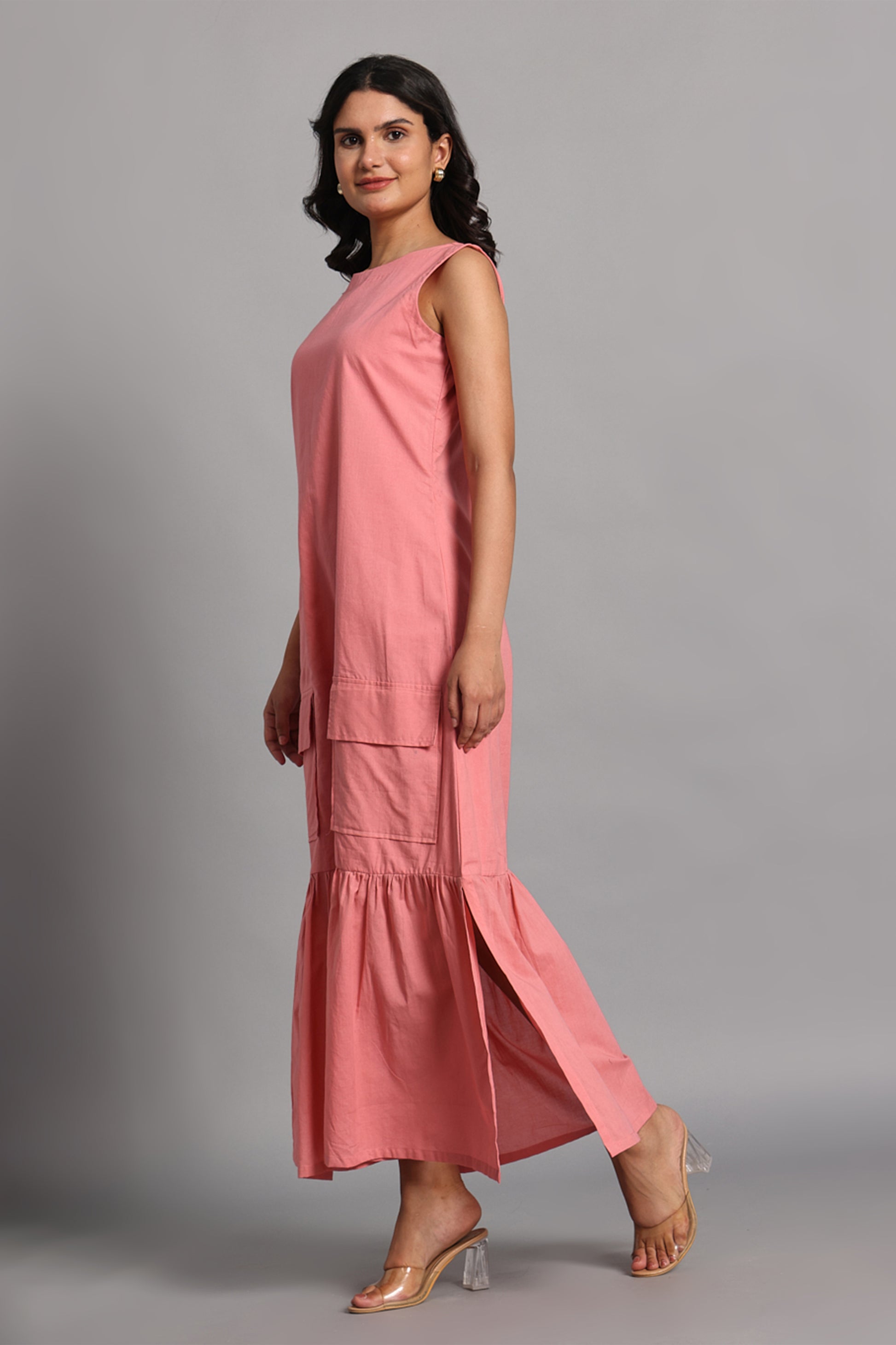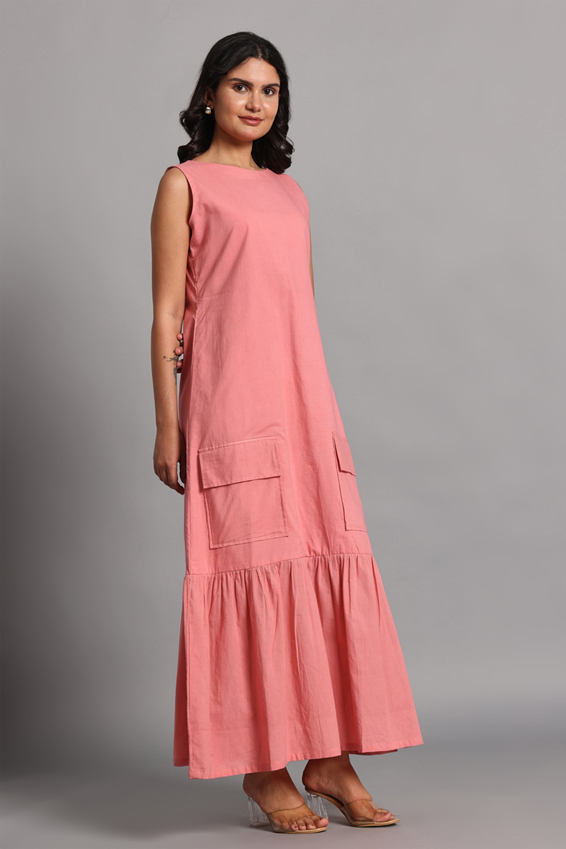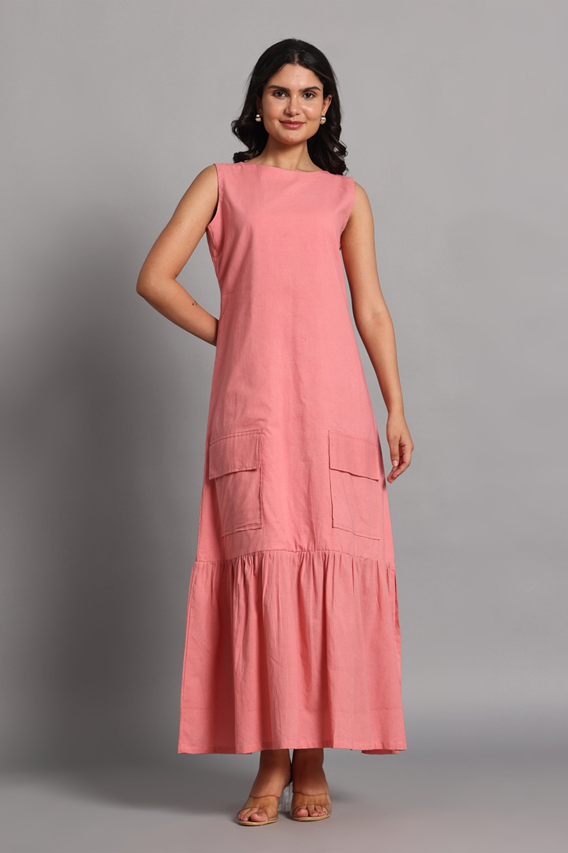 Noor Long Dress is a blend of charm and functionality, crafted in soft rose pink handwoven cotton. Designed for everyday ease with a playful twist, it features a clean sleeveless bodice, two utility-inspired front pockets, and a gathered hemline that adds volume and graceful movement. Lightweight, breathable, and endlessly wearable, this dress is as practical as it is pretty—perfect for slow days, spontaneous strolls, or creative studio hours.