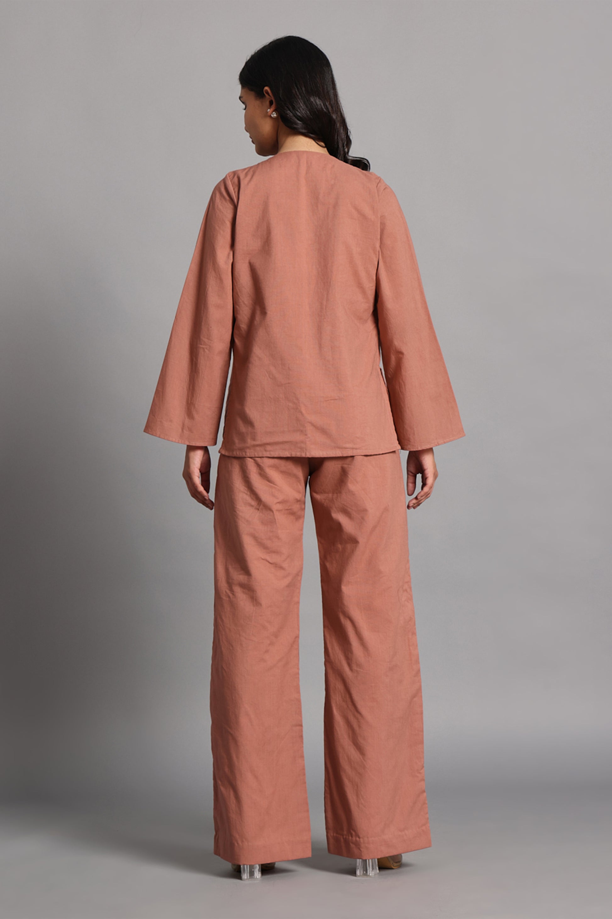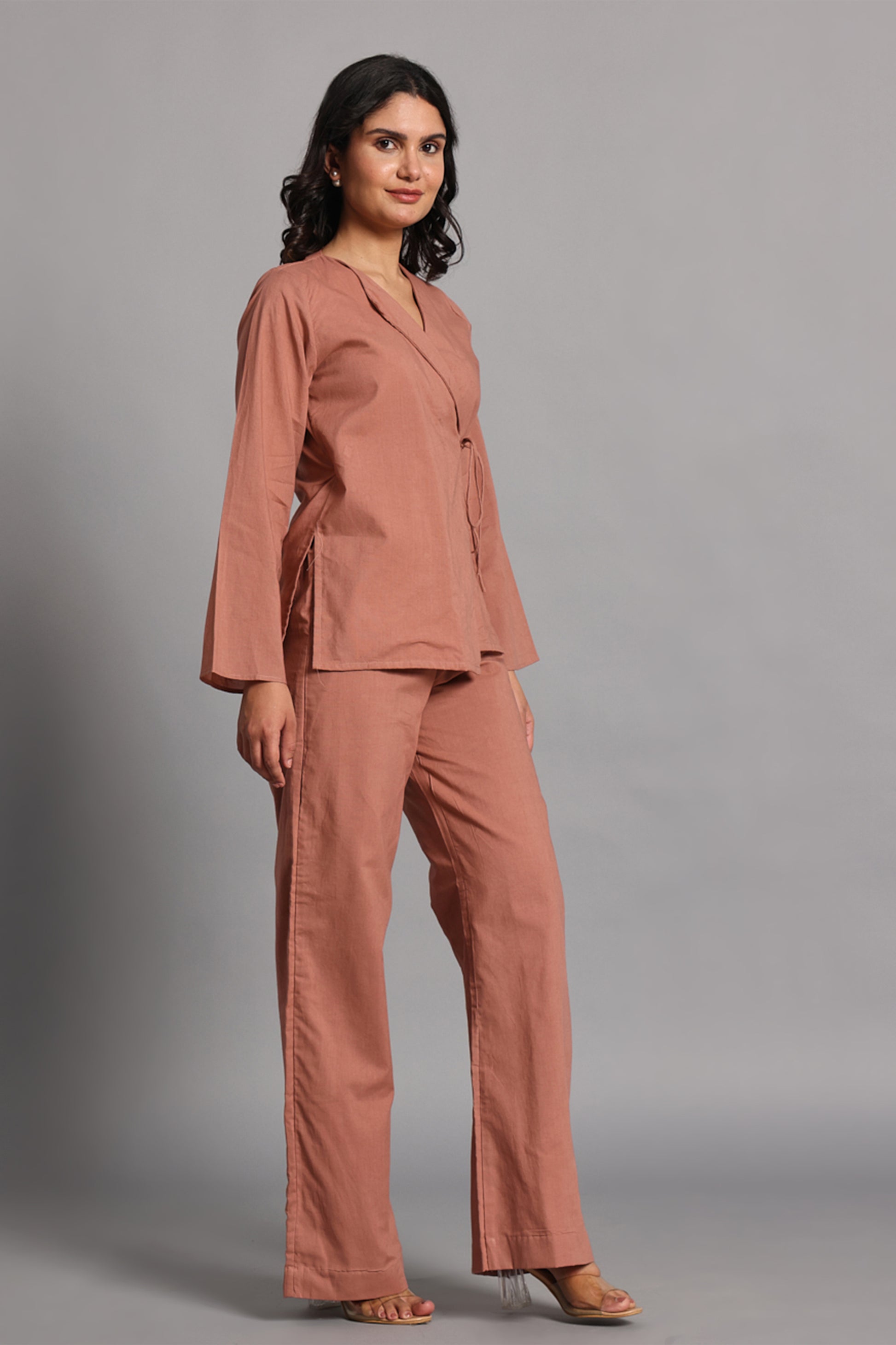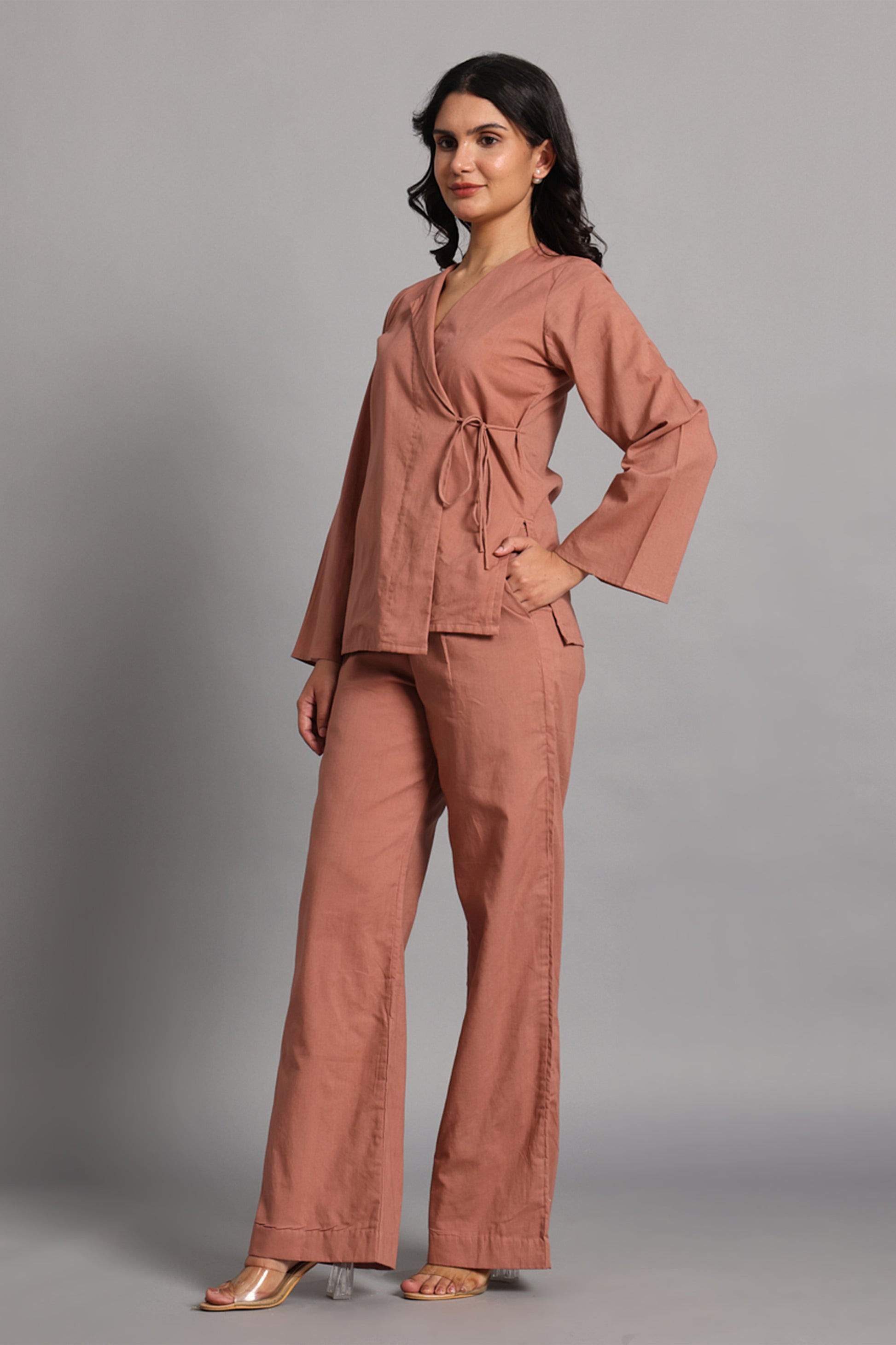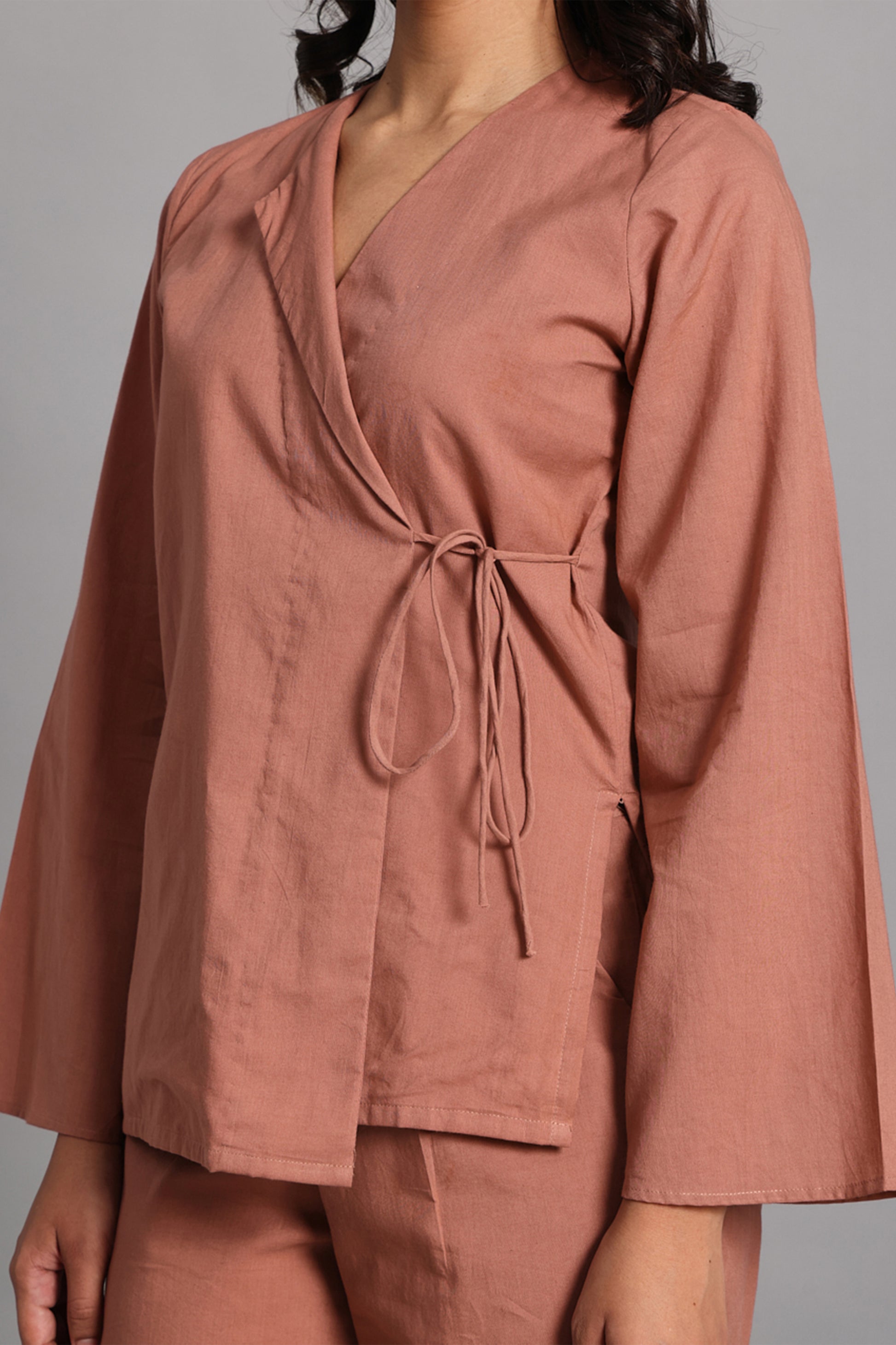 Rooted in stillness, the Maati shirt is a quiet ode to the earth beneath us. Cut from soft, breathable cotton in a clay-toned hue, this wrap-style top ties gently at the side, shaping the body with intention—never force. With its deep V neckline, full sleeves, and relaxed fit, it brings calm elegance to everyday rituals.
